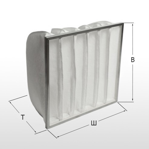 Фильтр воздушный карманный, фильтрующий материал meltblown зафиксирован проволокой 4-5 мм., размер 592х287 мм., толщина рамки 25 мм., глубина кармана 300 мм, количество карманов 8, класс очистки F6.